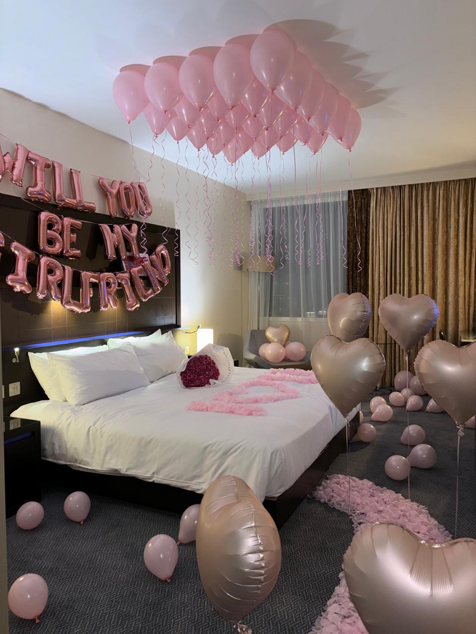 Our premium package offers a luxurious and thoughtfully designed hotel room transformation, perfect for special occasions. The setup includes 24 balloons elegantly placed on the ceiling (non-helium), creating a striking visual impact. A custom foil letter banner adds a personalised touch, while the bed is delicately adorned with rose petals for a romantic feel. The floor is styled with a soft trail of petals and loose balloons, complemented by 6 heart-shaped foil balloons. number balloons are included for birthdays but can be replaced with additional hearts for anniversaries or other celebrations.